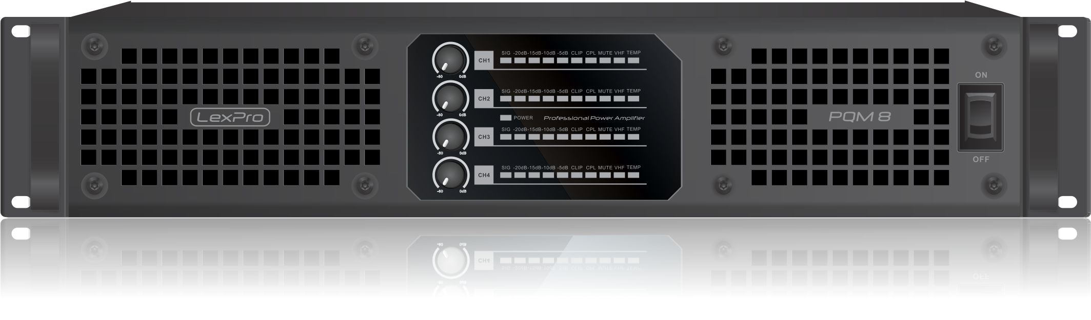 - Channel independent temperature, protection, VHF and clip warning indicators on the front panel.