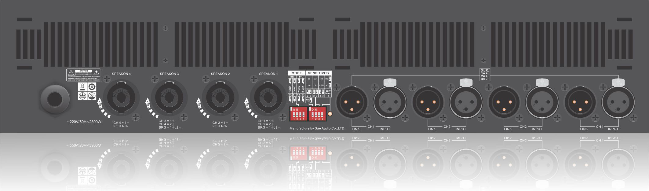 - XLR input and signal link connectors.
